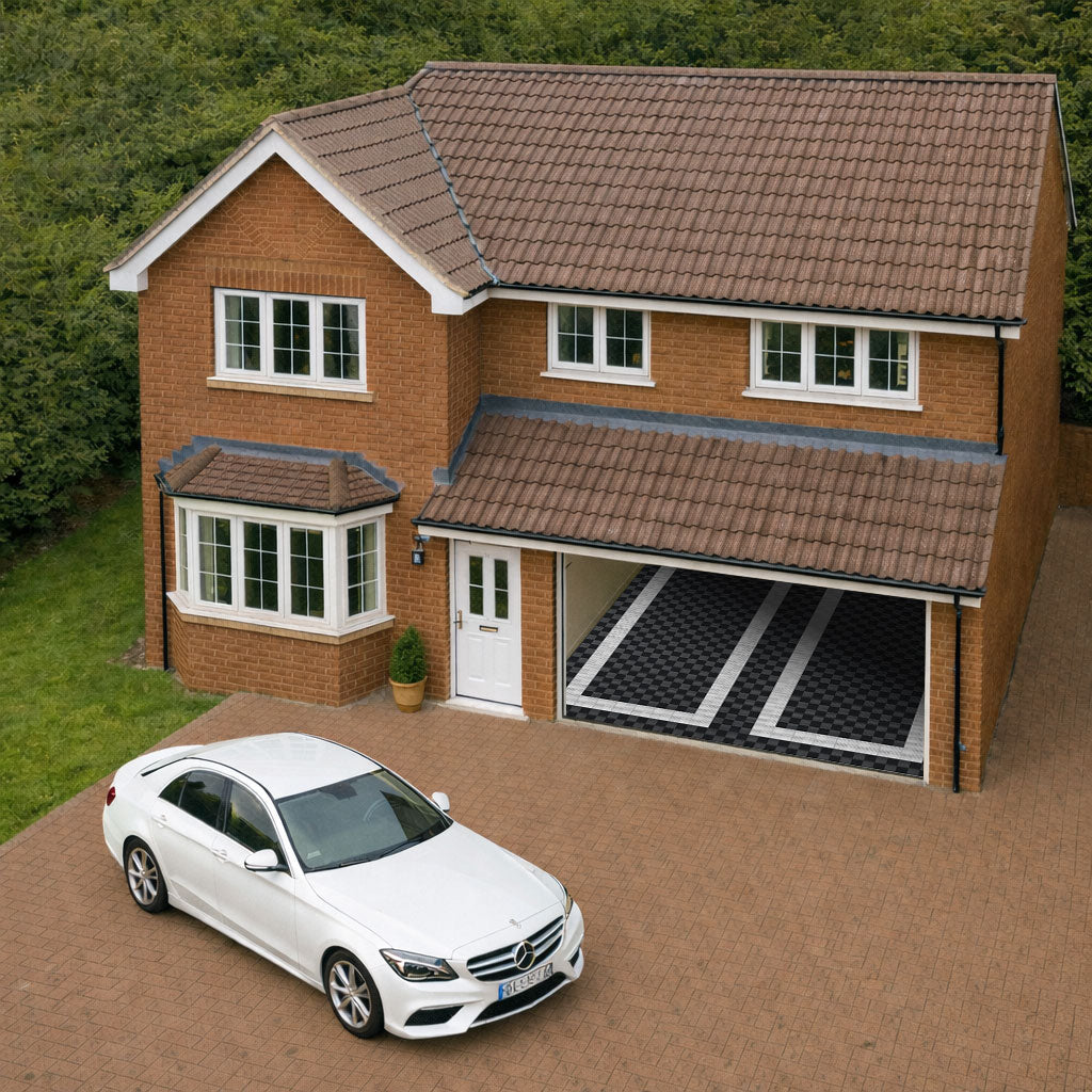 Upflor Mosaics turn modular flooring into a custom canvas for garages, showrooms, and display spaces.